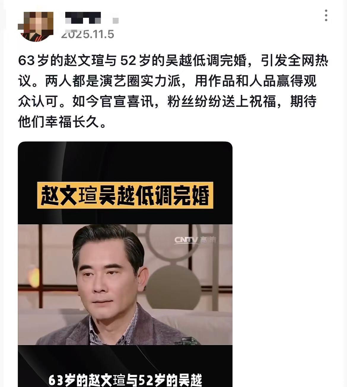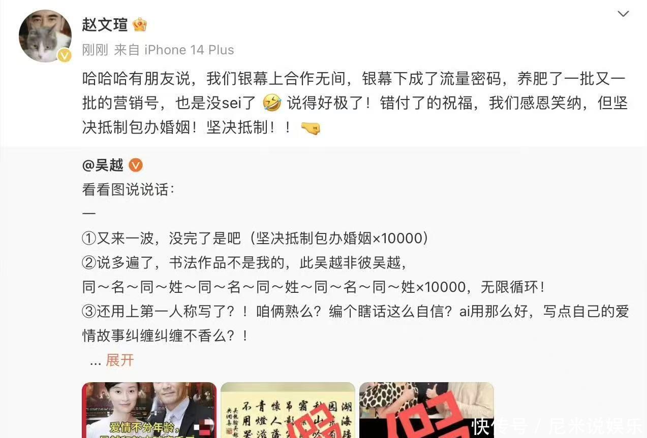在阅读此文之前,辛苦您点击一下“关注”,既方便您进行讨论和分享,又能给您带来不一样的参与感,感谢您的支持!文丨知意今年年初的时候,突然传出吴越和赵文瑄“牵手”的传闻,把他们两个人合作《夜明》的旧缘分说得天花乱坠,网友都说“是真的吗,那太好了”。但是事情才发酵没两天,吴越就火速下场发博澄清,她亲自截图辟谣直言“又来一波,没完了是吧,坚决抵制包办婚姻”,给这场闹剧画上了句号。